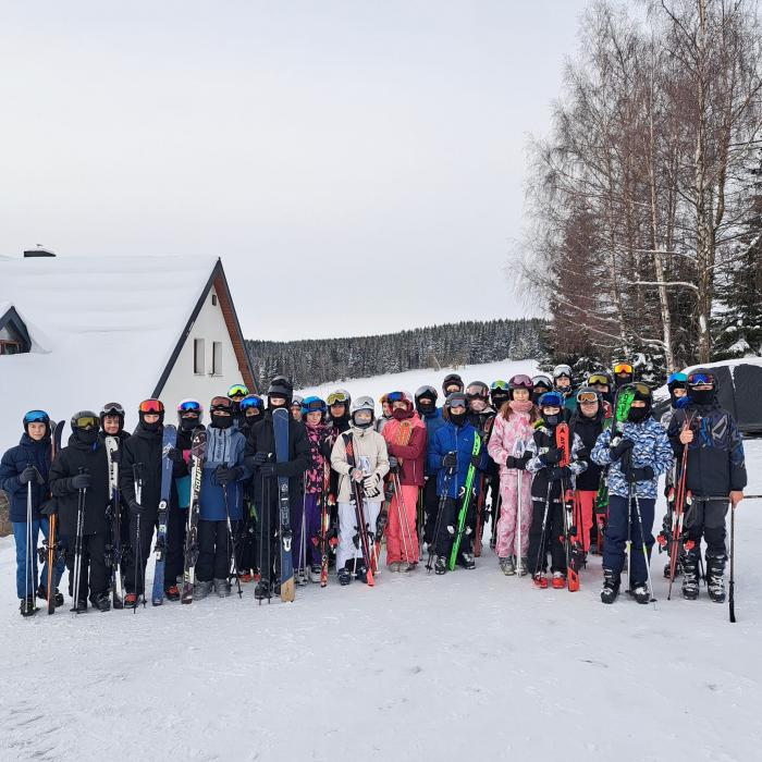 V půlce února se 80 žáků 7. ročníků zúčastnilo lyžařského kurzu. Zaplnili jsme celý penzion Mileta ve Velké Úpě. Odtud jsme vyráželi na sjezdovky, a to nejen na Portášky v Úpě, ale i skibusem do Pece pod Sněžkou. Počasí nás pozlobilo pouze ve čtvrtek, jinak jsme si užívali horského sluníčka. Smeknout naše přilby jsme museli před úplnými začátečníky, kteří přestože stáli na lyžích poprvé, se naučili kopce sjíždět kontrolovaně a bezpečně.
